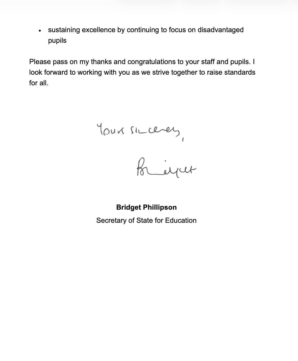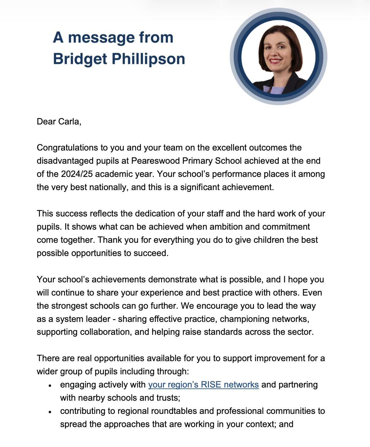 We are incredibly proud to see Peareswood Primary School recognised by the Secretary of State for Education, Bridget Phillipson, for the exceptional outcomes achieved by disadvantaged pupils at the end of the 2024/2025 academic year.